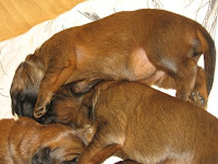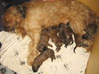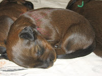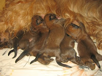 Die Welpen wachsen und gedeihen und werden von Tag zu Tag munterer. Der erste Welpe hat bereits die Augen einen kleinen Spalt geöffnet und auch die Fortbewegung besteht aus den ersten wackeligen und tabsigen Schrittchen.